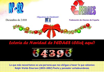 Se anuncia en el blog "Ataxia y atáxicos", que la "Federación Española de Ataxia, FEDAES", ha editado su boletín nº 92, correspondiente al mes de diciembre. Prodrá hallarse en la página web de FEDAES, haciendo click sobre el enlace más abajo indicado.